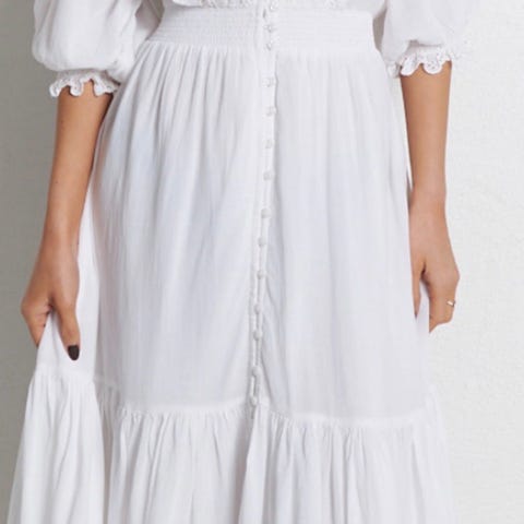 Camilla Pihl festkjole i størrelse S. Kjolen har korte, puffede ermer og en enkel, rett fasong. Har brukt bare en gang. Selges videre da er det for trangt til meg. Den egner seg til formelle anledninger.