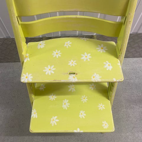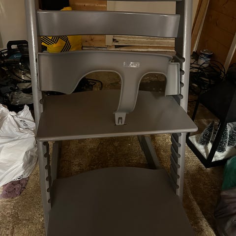 Stokke høy barnestol i rosa farge. Barnestolen er laget i tre og har justerbare setehøyder og fotstøtte.