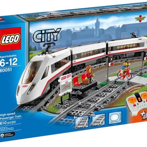 LEGO City Togsett høyhastighetstog med moderne design og detaljer som inkluderer passasjervogn og togstasjon. Settet er en del av LEGO City-serien og gir mulighet for bygging og lek med togtema.