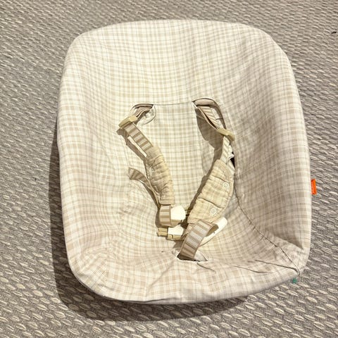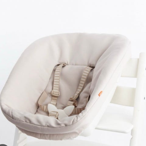 Stokke newborn seat med polstret sete og sikkerhetssele. Brukt på både ny og gammel tripptrapp stol uten problemer, klikker sikkert på plass. Følger også med bue for å henge på leke.