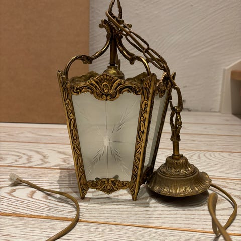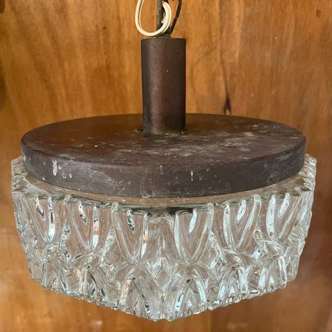 Fantastisk kul mid-century taklampe med messingfargede detaljer og glass med en nokså spesiell, men nydelig glans. Lampen er produsert i Norge av Mikkelsen og sønner. Skjermen, som kan tas av og på etter ønske og behov, har pådratt seg noen riper og er litt ujevn, og det er et lite hull i glasset (se bilde), men da det er så mye detaljer i glasset er ikke dette noe man legger særlig merke til. Alt i alt et smykke av en lampe, tross i sine skrammer ☺️ Ca høyde på kuppelen og kuppelfestet er ca 17 cm, pluss/minus.