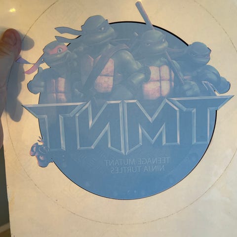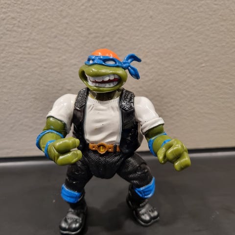 Teenage Mutant Ninja Turtles Shellraiser lekebil med tilbehør inkludert flere svarte dekk og en grønn og beige tilbehørsdel. Bilen har farger i brun, lilla og grønn, og er designet for lek. Figuren som følger med er en av Ninja Turtles.