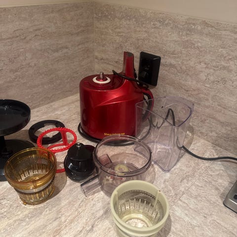 Kulz Juicer Model VSJ30 slowjuicer med effekt på 150 watt, designet i sølvfarge. Utstyrt med flere deler for å presse juice, inkludert filter og beholder. Egnet for kaldpressing av frukt og grønnsaker. Helt og fin, med noen bruksmerker.
