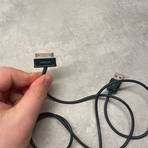 Følger ikke med kabel. Lades med micro usb.