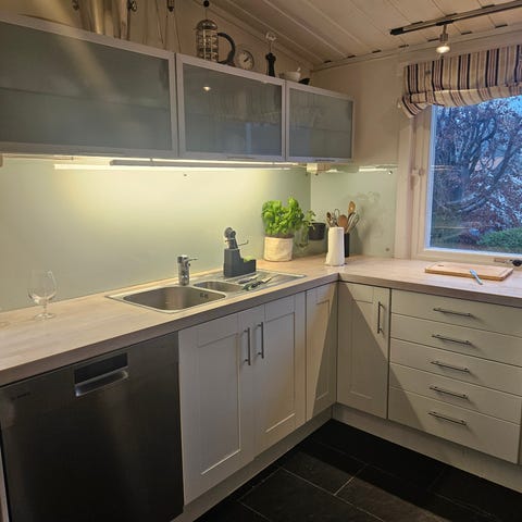 Stekeovn og platetopp er fra IKEA. Kjøkkenet har et kjøleskap og et fryseskap selges separat, men ønsker man disse også kan vi komme frem til fornuftig pris for alt.