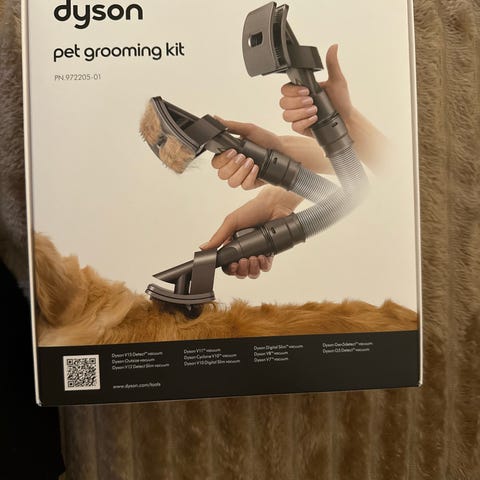 Dyson Pet Grooming Kit for børsting av kjæledyr. Den inkluderer spesialdesignede børster og verktøy for effektiv fjerning av løse hår og rensing av pels. Produktet er kompatibelt med Dyson støvsugere og er laget for å forbedre hygiene og stell av kjæledyr.