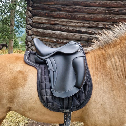 Shiny montesal 1,6kg selges med to padder, stigbøylereimer og bøyler, halereim, fortøy , sikkerhetsgjord og to drasjekker