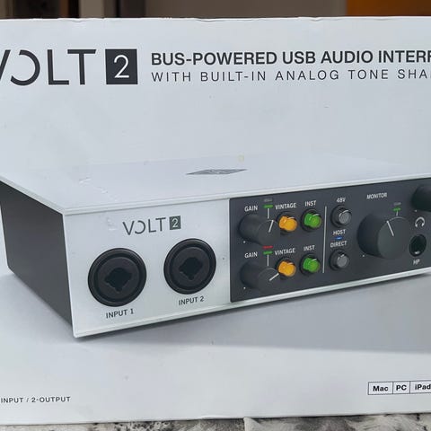 Focusrite Scarlett 2i2 lydgrensesnitt med USB-tilkobling. Enheten har to innganger og to utganger, designet for lydopptak og avspilling. Leveres i original emballasje.