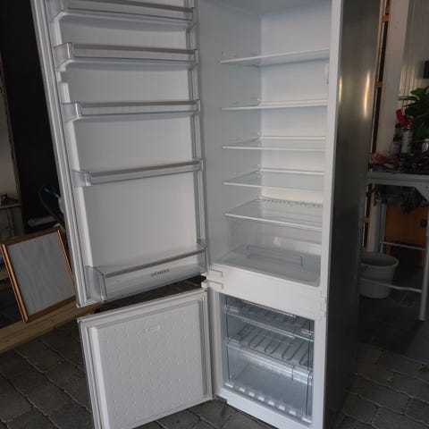 Point kombiskap med separat fryser og kjøleskap. Sort farge og tradisjonelt design. Passer til oppbevaring av matvarer med separate rom for frysing og kjøling.