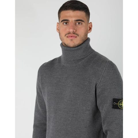 Knit turtleneck jumper in full rib RWS wool featuring a ribbed collar, finely ribbed cuffs with horizontal stitching, and a finely ribbed bottom band. Gauge 12.