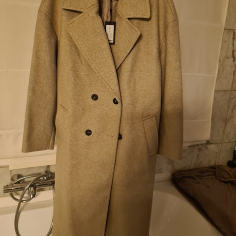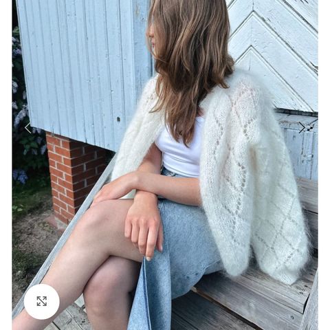 Ny hjemmestrikket jakke strikket i Bella by Permin (75% Kid Mohair-20% Ull- 5% Polyamid. Overvidde ca 98 cm - hel lengde 53 cm - ermelengde 49 cm.