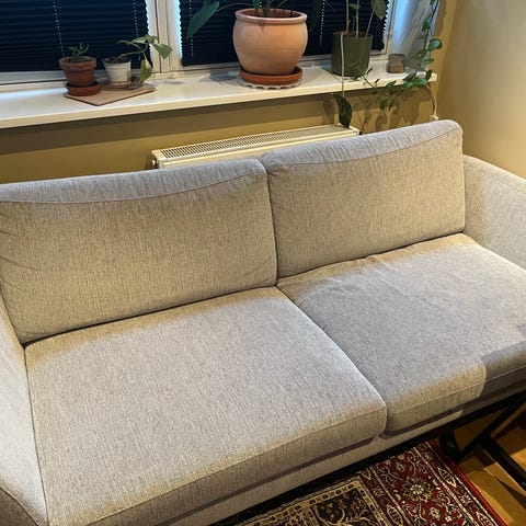 Pen sofa fra Bolia i blå velour, pent brukt, har ett lite merke som på bildet. Ikke lett synlig.