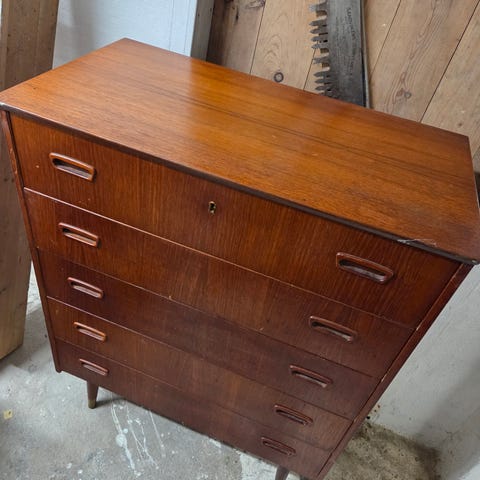 Møbelet fremstår i svært god vintage-stand. Overflaten har jevn og fin glød. Det finnes et lite, diskret svimerke på topplaten (se bilde), ellers normal aldersrelatert patina.