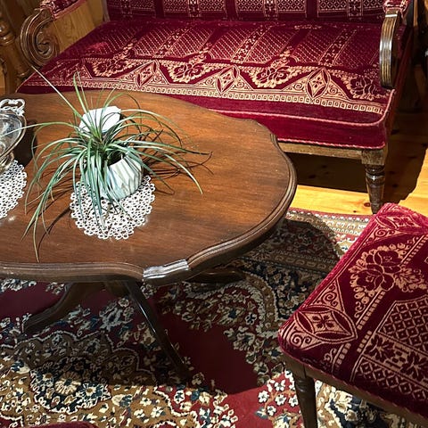 Eldre lenestoler og rundt bord