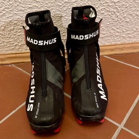 Brukt 4 ganger. Madshus Race Speed JR langrennssko i størrelse 39, svart farge. NB Juniorsko litt små/smale i str.