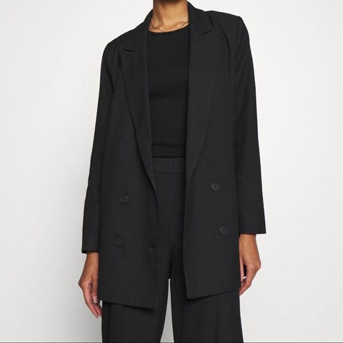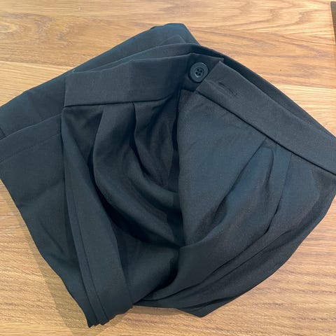 Svart dressbukse med lavt liv og splitt nede på beinet