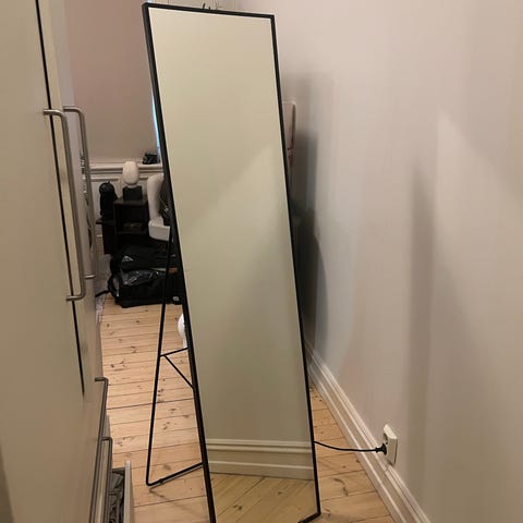 Praktisk gulvspeil fra IKEA med oppbevaring/knagger bak. Må hentes. Ekte bilder kommer