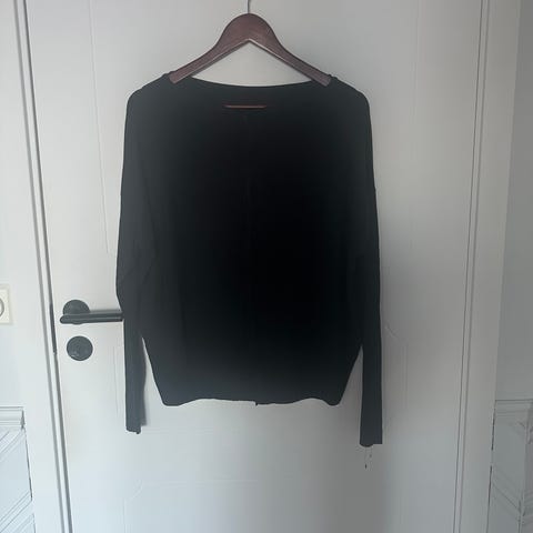 KappAhl genser i størrelse XL for kvinner, laget av bomull. Genseren er svart og har en enkel design. Materialet består hovedsakelig av bomull, noe som gir komfort og pusteevne.