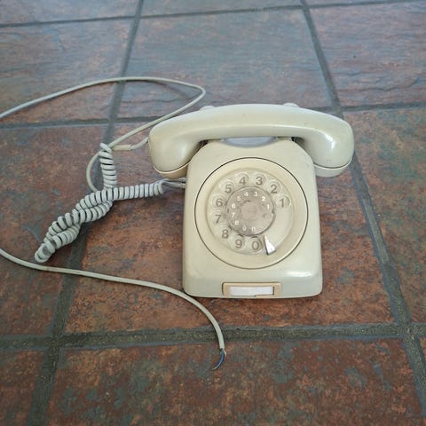 Selger en original norsk dreieskivetelefon fra Telegrafverket, modell 11AB22-63, produsert i 1977.
