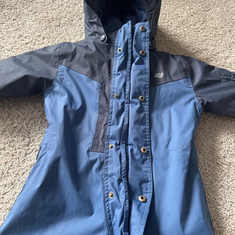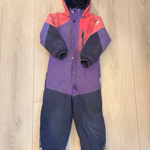 Skogstad barnevinterdress i størrelse 116, unisex modell i blå farge. Dressen har hette og flere lommer, egnet for utendørs bruk. Materialet er tilpasset barn og gir beskyttelse mot vær, vind og snø. En knapp gikk av, men glidelåsen fungerer helt fint.