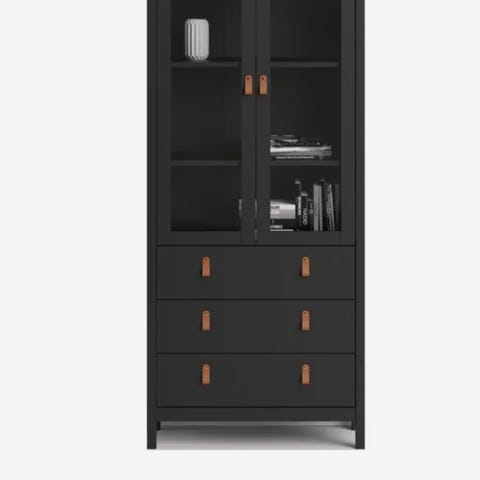 Seksjon i tre deler. Glasshyller og lys i glasskap. 800 kr eller bud.