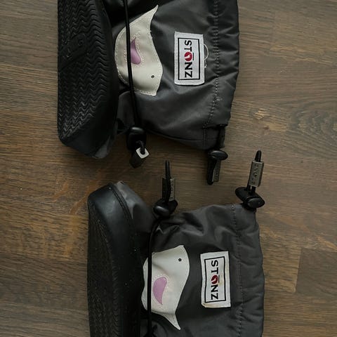 Søte og praktiske fotposer av merket Stonz. Et par i str M og et i str L. Begge har gummisåle. De i str. L har ekstra tykk fôring som kan tas ut og brukes separat. Begge er så og si ikke synlig brukt.