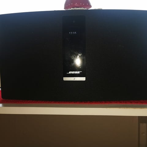 Harman Kardon Citation 100 trådløs høyttaler i grå farge med stofftrekk. Har kontrollknapper for avspilling og volum på toppen. Strømkabel tilkoblet. Designet for lydavspilling i hjemmemiljø.