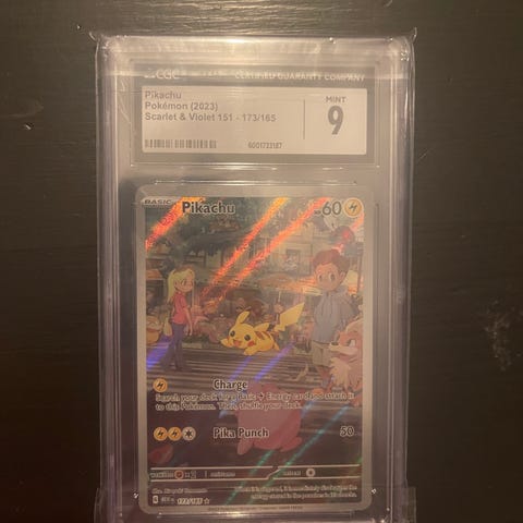 Pokémon samlekort med motiv av Pikachu og et annet Pokémon-kort. Kortene er i plastbeskyttelse og viser illustrasjoner fra Pokémon-serien.