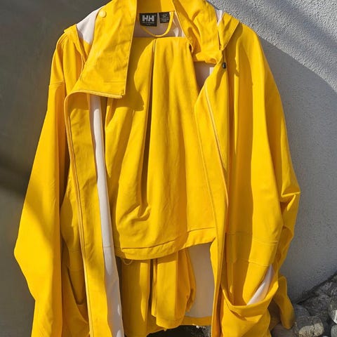 Selger en kul gul regnjakke med hette. Jakken har flere praktiske lommer og knappelukking i front. Perfekt til regnværsdager, festival, tur eller hverdagsbruk.