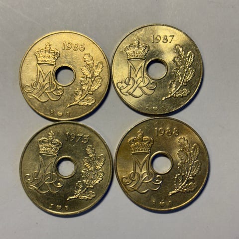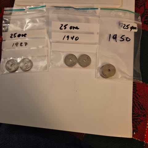 Norges mynthåndbok samling som inneholder forskjellige norske mynter organisert i en samlebok. Passer for myntsamler eller som referanse for norske mynter.25 ører