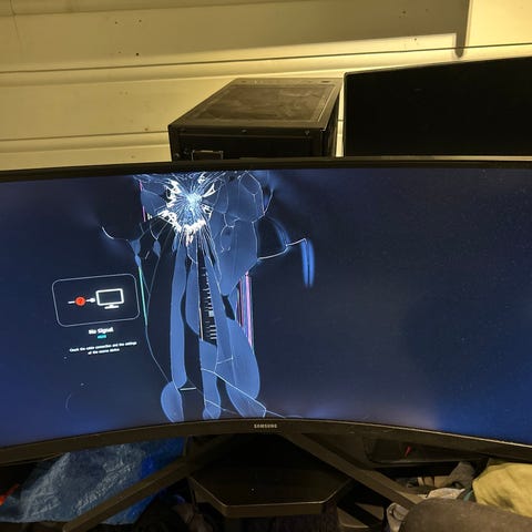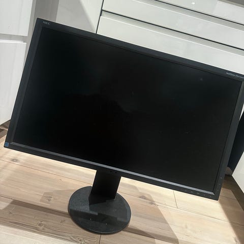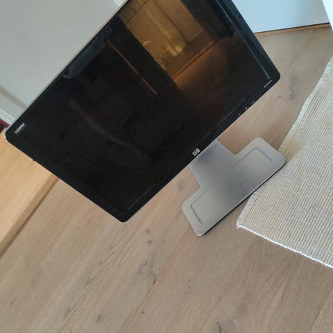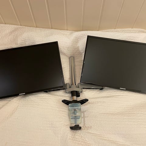Det følger med 2 stk Samsung skjermer, montert på stativet (se bilder). Stativet har feste klart for én ekstra skjerm i midten dersom man ønsker full 3-skjermsløsning.