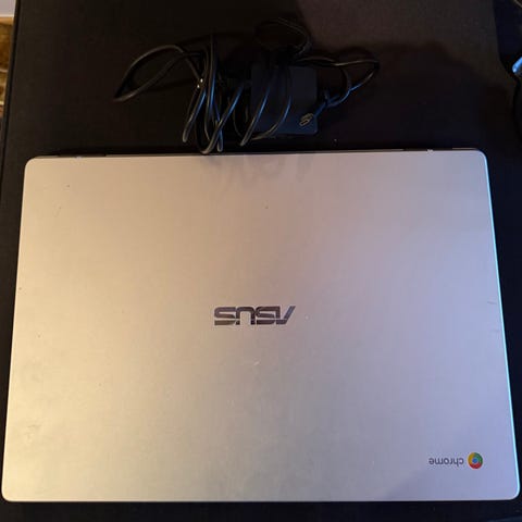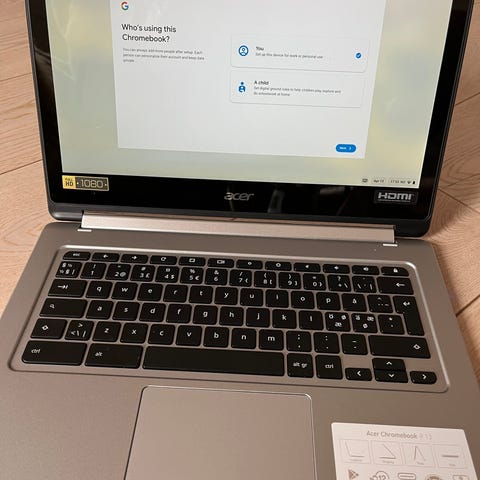 Acer Chromebook bærbar PC i sølvfarge. En bærbar datamaskin designet for bruk med Chrome OS, egnet for daglige oppgaver som nettlesing, dokumentbehandling og medieavspilling.