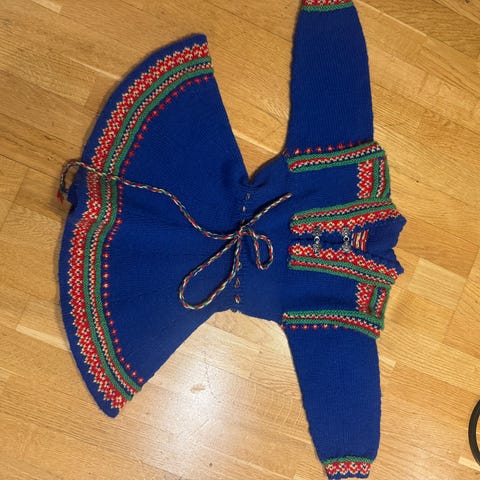 Nydelig kofte. Kjøpt av min bestemor i Nord for ca 10 år siden. Ren ull, nydelig håndarbeid. Er poncho-aktig. Følger med et skjørt (?) som kan sys på nederst eller brukes til noe annet. Håper den kan glede noen! Den er aldri brukt, kun hengt i stue som pynt. Mål og flere bilder kan sendes om ønskelig. Kan også høre med bestemor om mer info om det er ønskelig.