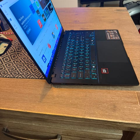 Jeg selger min Lenovo Yoga bærbar PC med integrert tastatur og skjerm. Enheten har et slankt og lett design i sølvfarge, egnet for bærbar bruk.