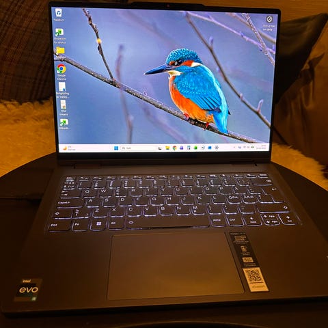 Jeg selger min Lenovo Yoga Pro 7 bærbar PC med integrert tastatur og skjerm. Enheten har et slankt og lett design i sølvfarge, egnet for bærbar bruk.