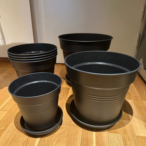 Svart medium Elho Grow Kit i resirkulert plast. Består av vanningsfat (ca mål: l 36 cm, d 25,8 cm, h 2,2 cm), brett (l 36 cm, d 26,5 cm, h 6,3 cm), lokk (l 35,8 cm, d 25,5 cm, h 12,9 cm).
