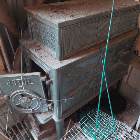 Jøtul F 602 vedovn i grått stål. Kompakt design med frontluke og luftregulering. Varmer godt.
