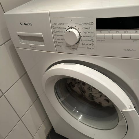 Samsung WW95GC0CAAE frontmatet vaskemaskin. Maskinen er hvit med svart dør og har en kapasitet på 9 kg.