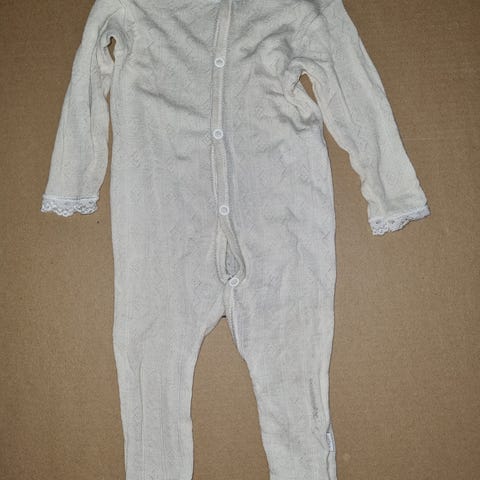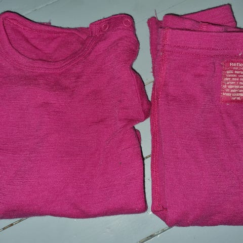 Lite brukt sett, nydelig farge. Str. 74. Body og longs i merinoull ytterst og bomull på innsiden.