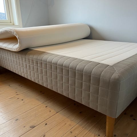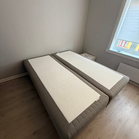 Bra seng med veldig gode madrasser. Ingen flekker på noen madrasser. Beskyttelsestrekk følger med. Brukt på gjesterom. Ene madrassen er en Tempur. Noen bruksflekker på selve rammen men det synes ikke mot en vegg.