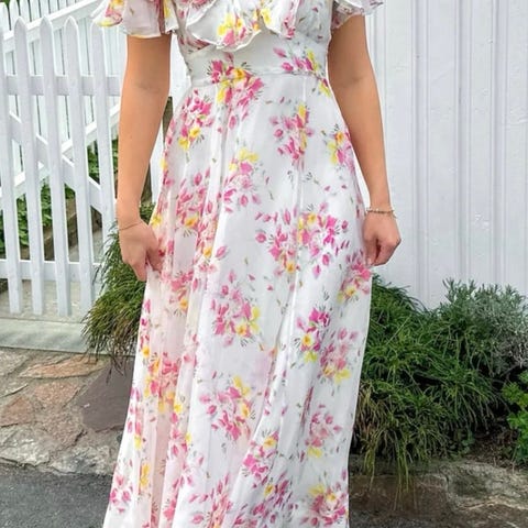 byTiMo kjole til spesiell anledning i størrelse M. Kjolen har flerfarget mønster og har skjult glidelås i ryggen. Knelang