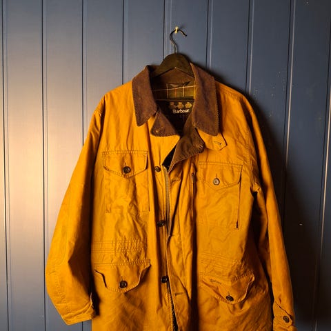 Barbour Jakke i størrelse L, laget av bomull. Jakken er brun/oliven farge o. Den har tradisjonell Barbour-rutet fôr og knapper foran.