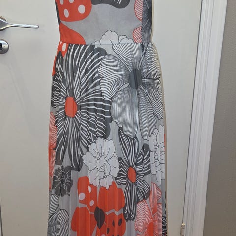 Vintage kjole fra 70 tallet fra ABO of Scandinavia. Størrelse 44, men er nok mer som størrelse 40. Uforet. Står ikke hva den inneholder, men er nok syntetisk. Den er i strechstoff og er uforet. Glidelås i ryggen. Brystvidde 102/104, lengde 142 cm.