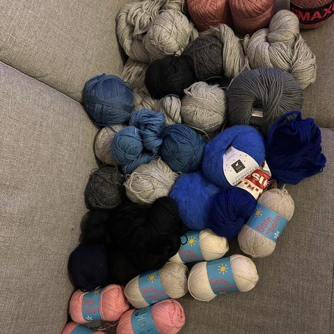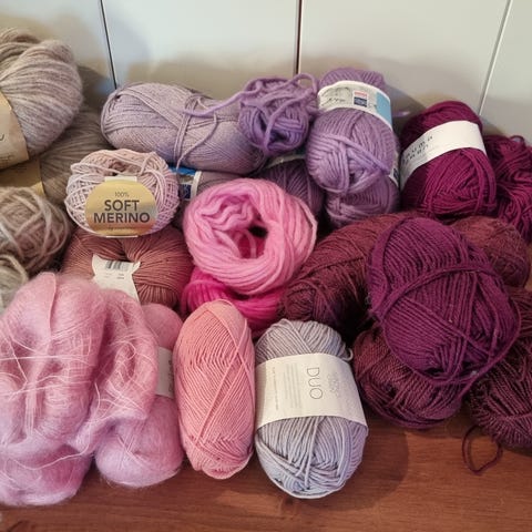 Pakke med diverse garn i flere farger og materialer. Inneholder flere nøster i ulike størrelser og farger, egnet for strikking og hekling.