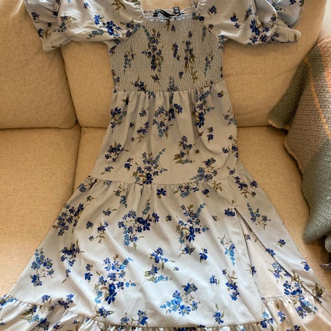 Omslagskjole med det nydelig sommerlig print i str. xs, men vil si den ka passe alt fra xs-m ved justering av omslaget☺️