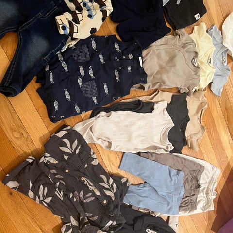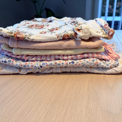 Sommerklær i størrelse 62: fire kortermet bodyer og èn pysj.