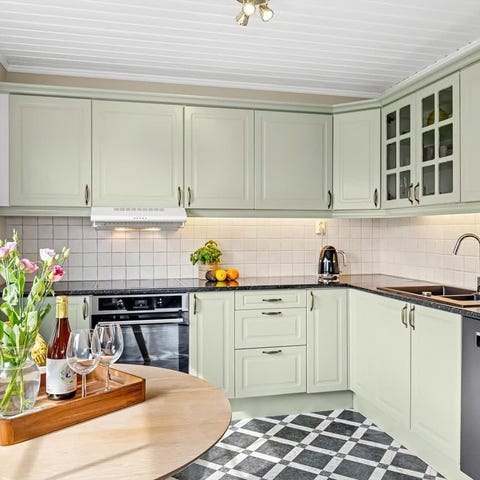 Kjøkkenskapene er malte i en beige tone og inkluderer: