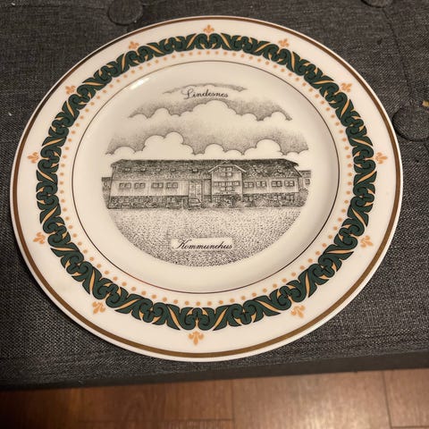 Aarikka Decor Art dekorasjonstallerken fra 1997. Tallerkenen har et dekorativt mønster med motiv av Nyplass skole og Lindesnes. Den er laget for dekorasjon og samling, og er merket med nummer 1 i serien. Gi bud.