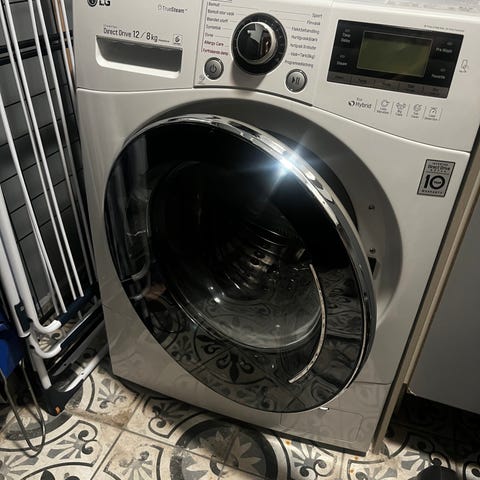 LG Kombinert vask/tørk maskin med integrert vask og tørk funksjon. Maskinen har en frontmatet trommel og elektronisk kontrollpanel for ulike vaske- og tørkeprogrammer.