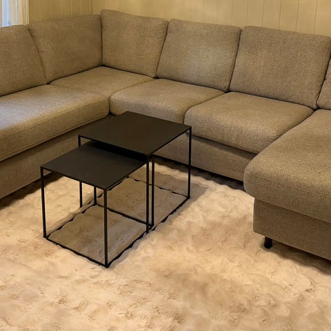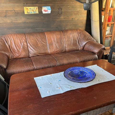 Ukjent sofa, fin i det semskete skinnet. Men den er løs i ryggen😊 Sto her når kjøpte huset